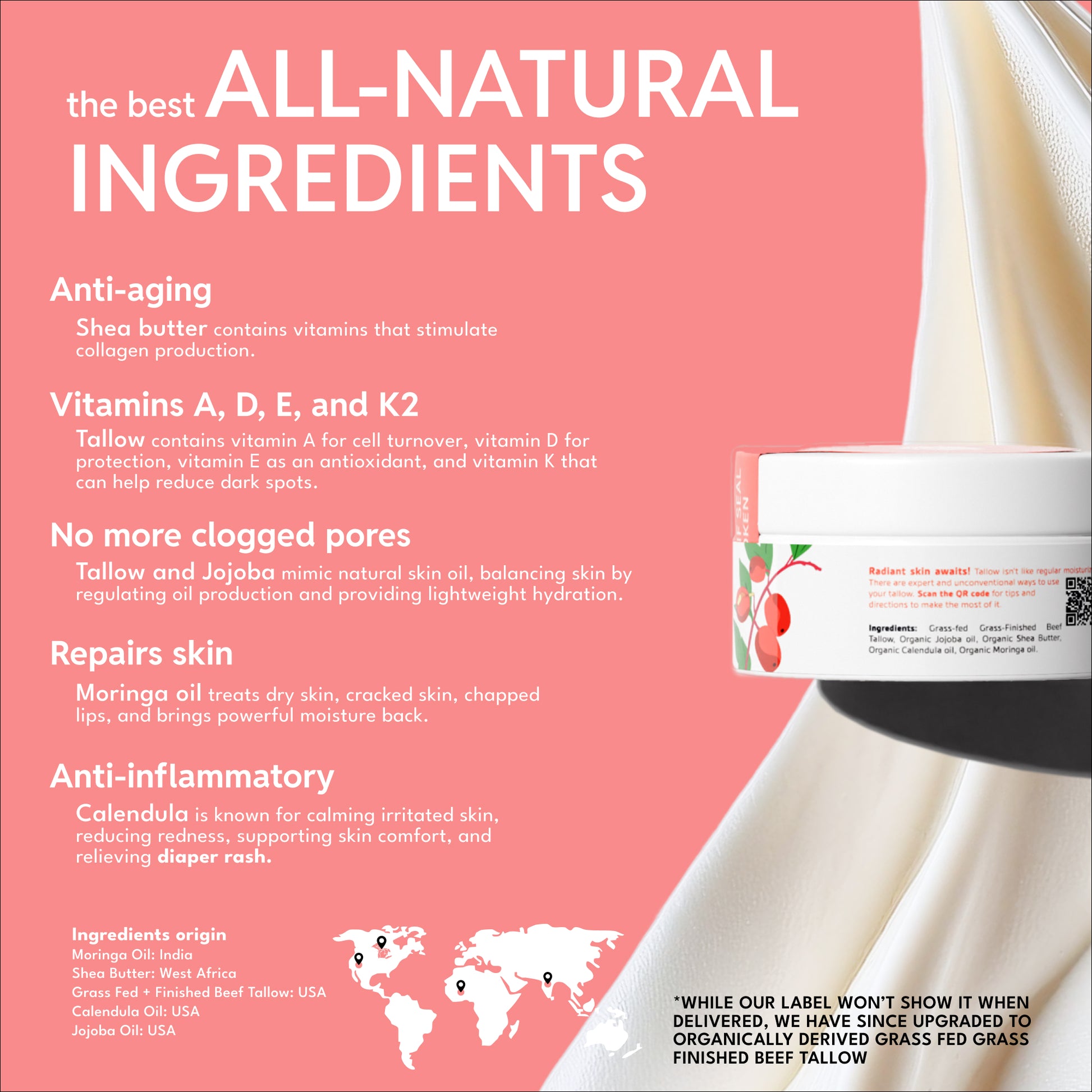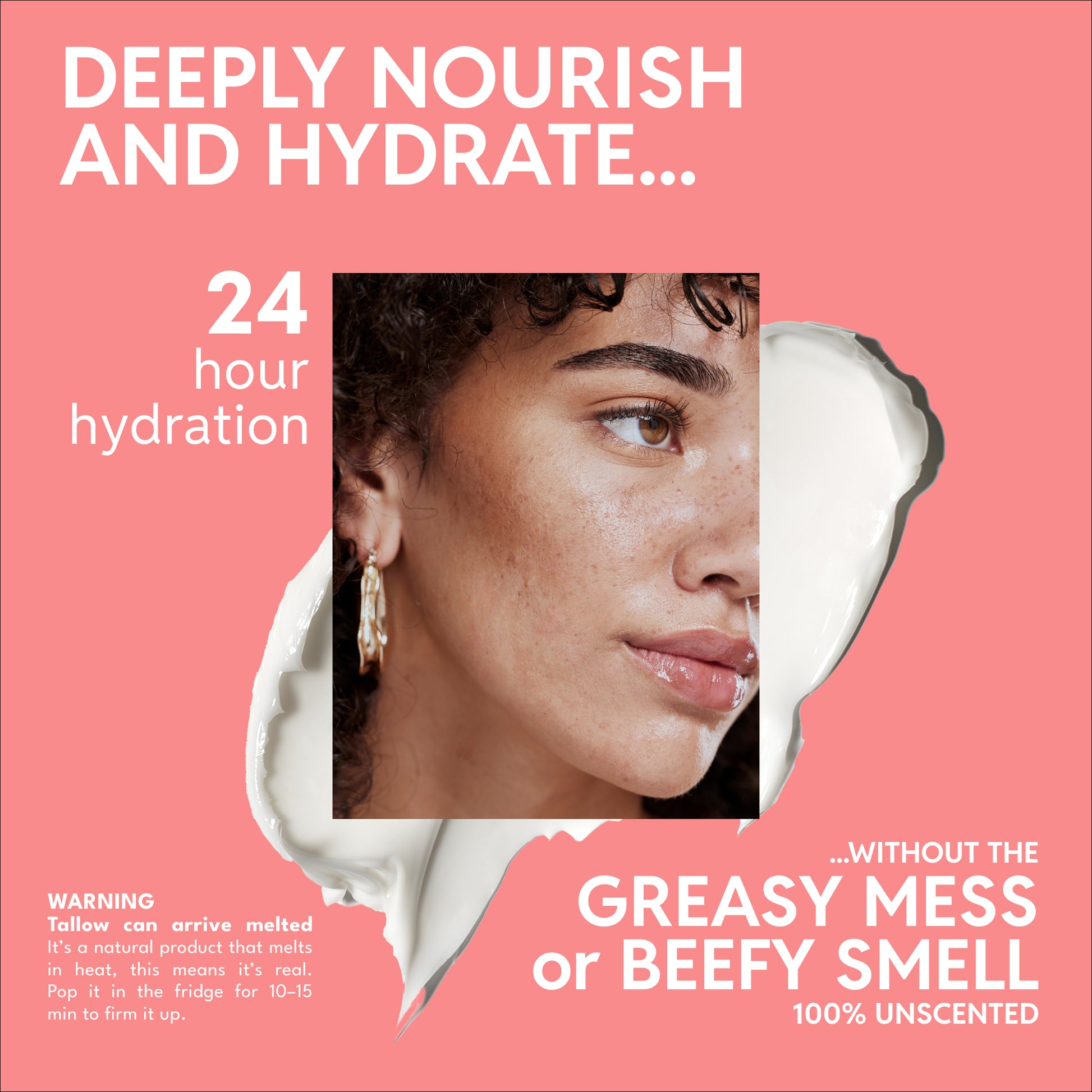 Crafted with grass-fed tallow and 100% organic ingredients, it contains no essential oils, added scents, or synthetic preservatives. Just pure nourishment your skin can recognize.